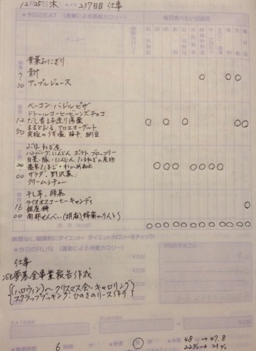 ダイエット食事日記241日目です。今日は、黒タートル、黒に紫の小花柄のチュニック、黒パンツ、靴下。外出しなかったのでこのままです。朝食は、ロールパン。今頃、再放送のドラマ「彼と彼女と彼女の生きる道」の録画を見てるのですが、リンちゃんは、毎朝レーズン入りロールパンですよね。なんて私は普通のロールパンでしたが。やはりリンちゃんの「はい」が可愛い。というか、いじらしい、、、スマートチーズ・パルメザン 焼きプリン・ほろにがカラメルソース。 母校の千葉大から校友会報が届きました。おやつはチョコとコーヒー。海苔煎餅とピーナッツも。大掃除を始めようかと思ったけど、主人が溜まった大河ドラマ「黒田官兵衛」を見ようというのです。やはり、昨日息子カズの下宿に車で荷物運びに行って疲れましたね。昼食は、ナポリタンスパゲッティ。ピーマンが無かったので、代わりにほうれん草? 玉ねぎのコンソメスープ。今日は台所だけ大掃除しました。といっても、先日長女マッキーの彼氏が来た時に結構掃除したので、あまりせずに済みましたが。台所の窓の前に多肉植物を置いてます。アイビーも。紅葉?換気扇も掃除して、フードのカバーも替えました。いろいろ飾ってるのですが、ハーブのドライも。大掃除終わってから、おやつに豆大福と緑茶。夕食は、いんげん・ポテトの肉巻き。唐揚げ。もやしのピリ辛炒め。ニラ玉。ひじき・大根・人参・油揚げの煮物。スパゲティサラダ。大根・胡瓜の糠漬け。ほうれん草の胡麻和え。いちご。練乳をつけて。夕食後、入浴前の体重48kg・体脂肪率21%、入浴後47.6kg、21%。今日は少し戻ったけど、リバウンドした分はなかなか戻りませんね・・・