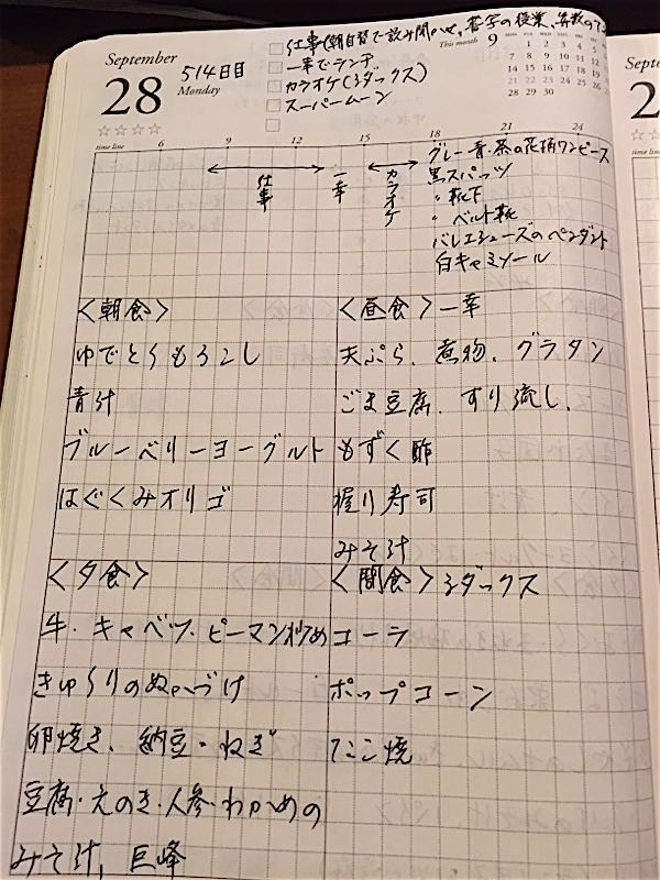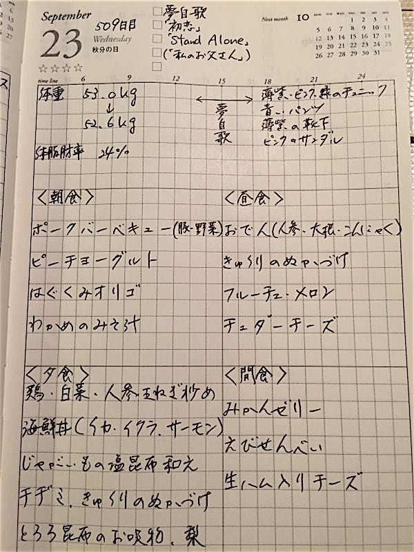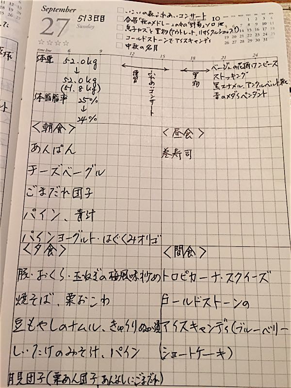 ダイエット食事日記514日目です。今日は、仕事、一幸でランチ、カラオケで、グレーに青・茶の花柄のワンピース、白キャミソール、黒スパッツ、黒靴下、黒ベルト靴。バレエシューズのペンダント。朝は涼しかったので、白のレースのカーディガン。でも、昼間は暑くなりましたね。朝食は、茹でトウモロコシの粒を取ったもの。青汁。ブルーベリーヨーグルト、はぐぐみオリゴ。勤務校では、小2の朝自習で読み聞かせ、算数のT2、書写の授業。書写では、折れ・曲がり・反り・点・画の方向をそれぞれ3択問題で出したり、新出漢字を教えた後、書写ノートで練習させました。終わった子にはプリントで練習。割と落ち着いてできたかな・・・書写ノートやプリントを丸つけしたので、少し残業。それから帰宅し、主人と一幸でランチしました。会員割引の葉書が来てたのです。私は寿司会席。2段になっていて、1段目は天ぷら、煮物、グラタン、胡麻豆腐、すり流し、もずく、味噌汁。2段目は寿司。主人は、松茸御膳。天婦羅、刺身、寿司。その後、シダックスでカラオケ。平日の午後2:30から18:00は580円でワンドリンク、ワンフード、コーラ2つと、ポップコーン、たこ焼き。私が歌った曲で、動画が見られます。途中でiPhoneの容量が足りず、録画出来なくなりましたが。Stand Alonehttps://youtu.be/EXryy7bNipYハナミズキhttps://youtu.be/4wyBd2id7RIあなたhttp://www.youtube.com/watch?v=5UuO4oBccFsI love youhttp://www.youtube.com/watch?v=m74xfpVIwVk会いたいhttp://www.youtube.com/watch?v=JD3tvLyZCUo愛の讃歌http://www.youtube.com/watch?v=mb9eatquD3s生まれ来る子どものためにhttp://www.youtube.com/watch?v=C5lHLqbPixc星に願いをhttp://www.youtube.com/watch?v=S_xL_MzD57o恋人よhttps://youtu.be/S9sEGFfTyBM恋におちてhttp://www.youtube.com/watch?v=4Z5hrbSFs3Y越冬つばめ、天城越え、頑張っていこうぜ、花は咲く。この4曲は録画できませんでした・・・帰ってから、スーパームーンを見ました。昨日は中秋の名月で十五夜だけど、今日が満月だそうです。朧月でしたが、覆ってた雲がなくなってきた。 義母がススキを持って来てくれました。夕食は、牛・キャベツ・ピーマン炒め。胡瓜の糠漬け。卵焼き。梅風味黒酢たれ納豆。ネギ。豆腐・えのき・人参・わかめの味噌汁。巨峰。やはりまた食べすぎですね・・・