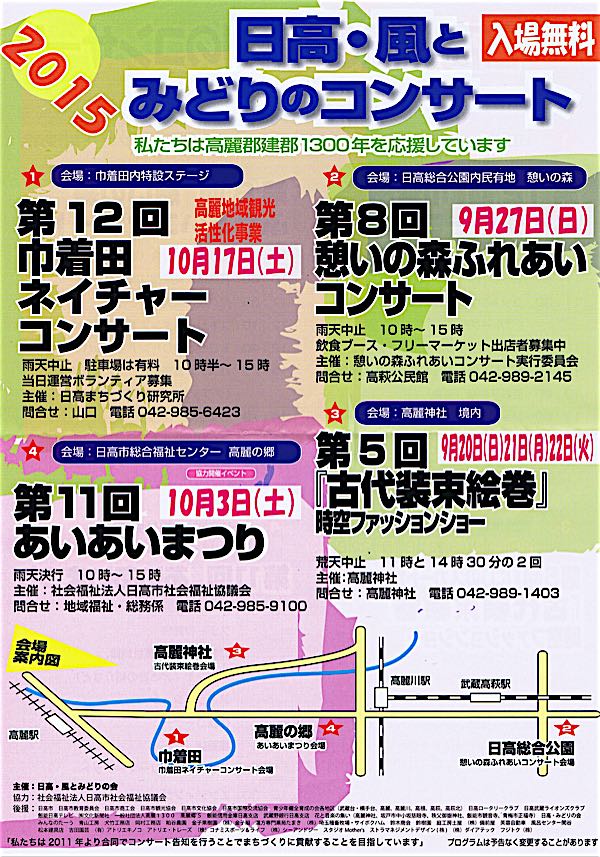 今日は、憩いの森ふれあいコンサート。屋外なので、雨天中止ですが、天気が降ったりやんだりと不安定・・・中止の連絡がないので、やるのかな。ともかくO先生宅へ練習に行くことにしました。パステル音楽館は、13:25~14:10までの予定でしたが、次の団体がキャンセルになったため、その時間帯もやり、最後の「みんなで歌おう」もやることになったそうです・・・8月30日の夏のチャリティ20周年コンサートのDVDが出来たので買いました。第2部の合唱組曲「主婦の詩」より。私も合唱に参加したのです。コンビニで巻き寿司を買っていき、皆さんにも差し入れ。K先生からいただいたチョコ。合唱などの練習後、日高市総合運動公園へ行き、憩いの森ふれあいコンサートの会場へ。本当に森の中で、小雨でも樹が遮ってくれそうです。SGSおやじBANDの皆さんのステージ。パステル音楽館のメンバーの車が駐車場に入りきれず、遠くの駐車場に停めに行って、まだ会場に到着しないので、何度もSGSおやじBANDの皆さんにアンコールでつないでもらいました。帽子に缶細工をぶらさげて売っていたおじさん。K先生が買ってかぶってました。O先生が「千の風になって」を独唱。その他、女性ソロや、二重唱も。私は合唱のみで、「秋のメドレー」「Stand Alone」「広い河の岸辺」「山へ行こう」。「秋のメドレー」の中で「野菊」をソロで歌わせてもらいましたが、うまく歌えませんでした・・・やはりみなさんとはレベルが違うと痛感させられてしまいました・・・声が細かく震えてしまうのと、音程が安定しないのですよね・・・レッスンでも練習したのに・・・右の曲名をクリックするとレッスン時の「野菊」が聞けます。「野菊」レッスン時より、テンポが遅かったのもあるけど、やはり緊張して、ますます震えてしまいました・・・それでも、司会のK先生が私を紹介してくれて、活動を宣伝するように言ってくれたので、夢自歌の発表会が10月24日(土)14:00~入間市のアミーゴでやることを言わせてもらいました。他の方たちも、ソロを歌った後、紹介してるのです。また、ケーナを売ってた方が「コンドルは飛んでいく」を演奏してくれました。下の青竹は、8/30の国会前の安保反対デモで、ほら貝のように吹いていた人たちを見かけて作ったそう。出演料代わり?にふれあいコンサート会場で売っていた栗おこわ、焼きそばをいただいて帰ってきました。スタッフとの記念撮影は早く帰るためにパスさせてもらいました。息子カズが久しぶりに帰ってきたので、一緒に買い物に出かける為です。