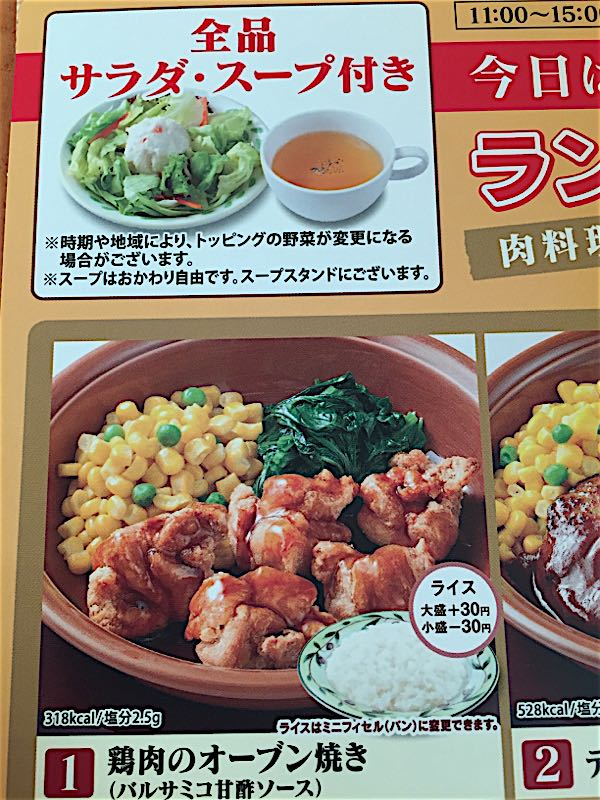 サイゼリアで一人ランチ。おひとり様も慣れてきたなあ・・ランチセットの鶏肉のオーブン焼き・バルサミコ甘酢ソース(318kcal)にしました。ライス小盛りに。サラダ。スープ。鶏肉のオーブン焼き・バルサミコ甘酢ソース(318kcal)。ほうれん草、コーン・青豆。ライス・小盛り。30円引き。パンにも替えられたけど、ライスは小盛りでも実際にはほとんど食べずに残したから、糖質オフには良かったかも。パンだとついみんな食べちゃうしね・・・鶏に唐辛子フレークをかけて、新陳代謝を増す?