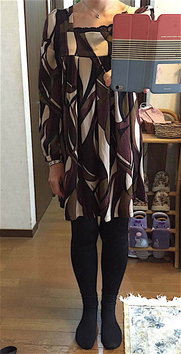今日は、仕事、花の撮影、車の修理で、茶とベージュのワンピース、黒キャミソール、黒スパッツ、黒靴下、黒ベルト靴、青のペンダント