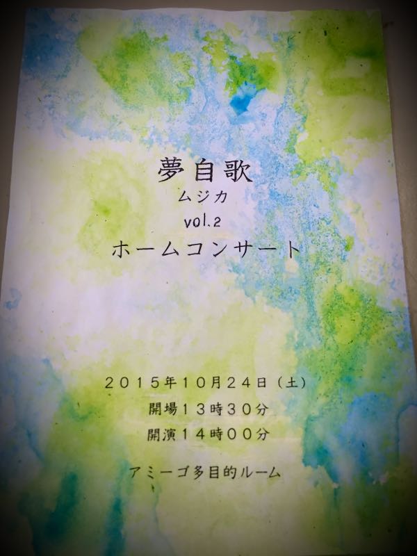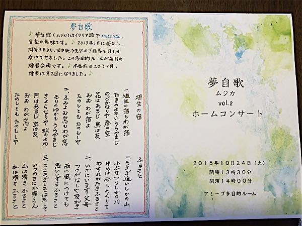 夢自歌の発表会(ホームコンサート)のプログラムの表紙。Sさん作成。10/24(土)の2時からで、あと1ケ月ですね。プログラムの内容だけ私がWordで入力して印刷。プログラムの外枠や、裏表紙の歌詞などもSさん作成です。埴生の宿や、ふるさとを最後にお客様と一緒に歌います。今日は主人が車を使ってたので、夢自歌に行くのに、バスに乗ろうと思ったら乗り遅れ、歩いて行き、遅刻してしまいました。曲名をクリックすると歌が聞けます。良かったら聞いてみてください。ソロの曲。「初恋」、「スタンドアローン」、「私のお父さん」。重唱は、「メリーウィドウワルツ」、「森へ行きましょう」。「森へ行きましょう」はアハハの掛け声など手伝います。合唱は、「エーデルワイス」、「遥かな友」です。