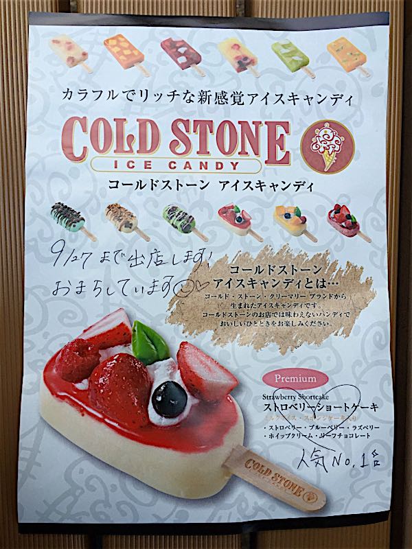 アウトレットで、コールドストーンのアイスキャンディ。以前店舗があったのですが、 今は無くなり、代わりに?露天で営業してました。それも今日までだそう。色とりどりのアイスキャンディが並んでいたけど、ブルーベリーショートケーキにしました。美味しかったけど、480円とは高いなあ・・・