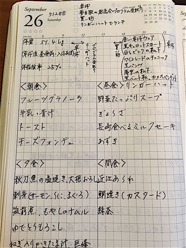 ダイエット食事日記512日目です。 今日は、卓球、リンガーハットでランチ、夢自歌のプログラム受取り、買物です。卓球には、赤の卓球ウェア、黒キュロットスカート、ピンクと白の靴下、卓球シューズ。帰って入浴後、着替えました。ワインレッドのチュニック、黒のパンツ、薄紫の靴下、黒のベルト靴。カメオペンダント。朝食は、フルーツグラノーラ。青汁。牛乳を入れました。トーストをチーズフォンデュにしました。卓球の練習後、入浴。体重は、卓球後・昼食前・入浴前後変わらず51.4kg。体脂肪率は、25%。主人とリンガーハットでランチ。私は、野菜たっぷり食べるスープ。糖質60%OFFというけど、麺が無くて、野菜だけでもまだ糖質があるのですね。麺の代わりに野菜がたっぷりで、食べきれずに主人にも食べてもらった。高血圧の主人は、減塩長崎チャンポン。少し麺をもらいました。野菜に柚子胡椒ドレッシング。福岡にも柚子胡椒があったなあ。餃子を二人で一皿。長崎食べるミルクセーキ。あずきをトッピング。アミーゴへ夢自歌のプログラムを取りにいきました。Sさんが作成してアミーゴに預けておいてくれたのです。10/24(土)14時からアミーゴで行う声楽の発表会です。クリーニング店でもらった巾着田の曼珠沙華のパンフレットと、絵葉書。今が見頃だと思うのですが、きっと混んでるだろうなあ。間食は、主人がもらってきた近江あられ。義母・主人とスーパーで買い物した後、フードコートで鯛焼き(カスタード)を食べました。また、食べ過ぎてしまった、、、