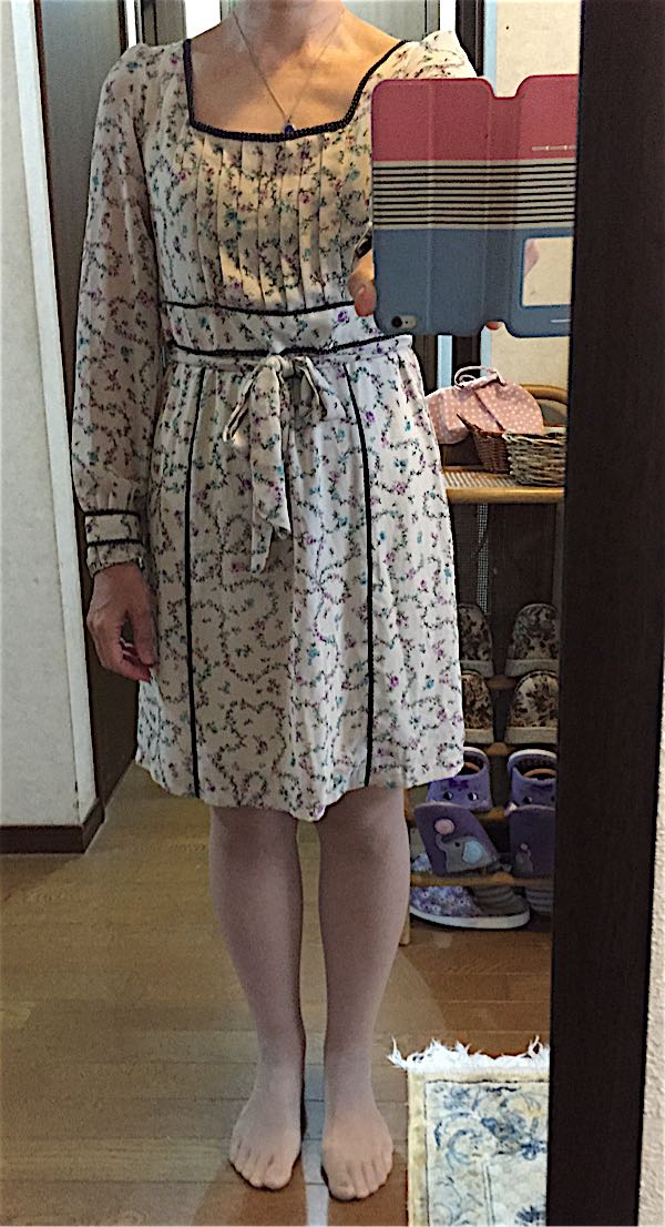 今日は、ふれあいコンサート、息子カズと買物で、ベージュに花柄のワンピース、ストッキング、黒のエナメルのアンクルベルト靴。青いメダイペンダント。