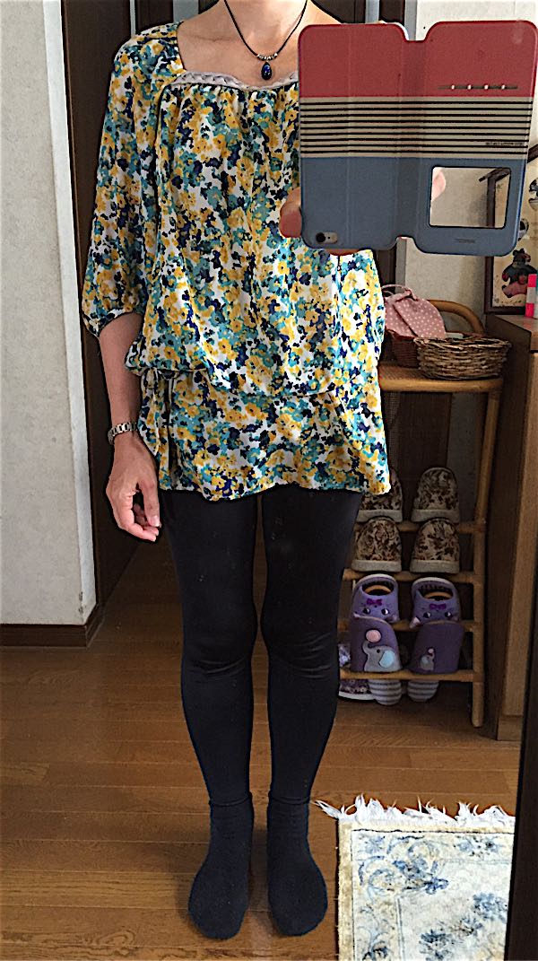 今日は、歯医者、実家、父の見舞いで、黄色・青・緑・白の花柄のチュニック、黒スパッツ、黒靴下、黒ベルト靴。蛍ガラスのペンダント。母から手編みのカーディガンをもらいました。機械編みですが。黄・青・グレーの面白い配色と思ったら、残り毛糸で編んだらしい。今日のチュニックと同じような色遣いでしたね。