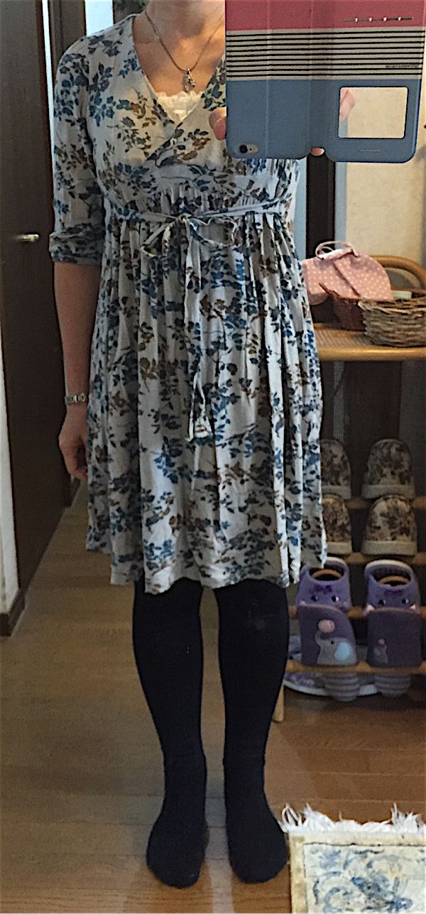 今日は、仕事、一幸でランチ、カラオケで、 グレーに青・茶の花柄のワンピース、白キャミソール、黒スパッツ、黒靴下、黒ベルト靴。バレエシューズのペンダント。朝は涼しかったので、白のレースのカーディガン。でも、昼間は暑くなりましたね。