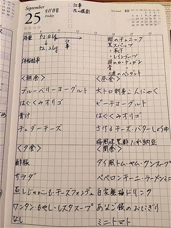 ダイエット食事日記511日目です。今日は、仕事、花の撮影で、紺のチュニック、黒スパッツ、黒靴下、黒レインブーツ。3連ペンダント。涼しくて緑のカーディガンも。仕事から帰ってからは、寒くなって青い厚手のカーディガンに着替えました。朝食は、ブルーベリーヨーグルト、はぐぐみオリゴ。チェダーチーズ。勤務校では、小2の算数のT2。帰ってから、花の撮影。アザレア。秋明菊。秋海棠。昼食、間食。大トロ刺身こんにゃく。からし酢味噌で食べました。ピーチヨーグルト、はぐぐみオリゴ。さけるチーズ・バター醤油。梅風味黒酢だれ納豆。タイ風トム・ヤム・クン。寒くてこごえてしまった・・・温かい物が欲しくてスープを飲みました。ペペロンチーニ・ミニカップ。ラーメンとパスタと両方できるけど、ラーメンにしてみました。自家製梅ドリンク。寒いので、お湯を入れてホットドリンクにしました。あなご飯のおにぎり。ミニトマト。夕食は、酢豚。サラダ。蒸しジャガイモ。チーズフォンデ風チーズソースに付けて食べました。ワンタン・もやし・レタスの中華スープ。梨。体重は、夕食後・入浴前52.4kg、入浴後52.2kg。体脂肪率は、27%から26%へ。体重が少し減ったと思ったら、今度はその分体脂肪率が増えてしまった・・・体重のグラフです。1週間。最近はちょっと減ったからこの調子で頑張らないとね・・・。1週間平均で1ヶ月。増え続けてます・・・3ヶ月。半年。なんとか維持してたのに、8.9月で増え続けてますね・・・1年。1年半。せっかく13kgくらい痩せたのに、半分くらいリバウンドしてしまってる・・・また頑張らないとなあ・・・