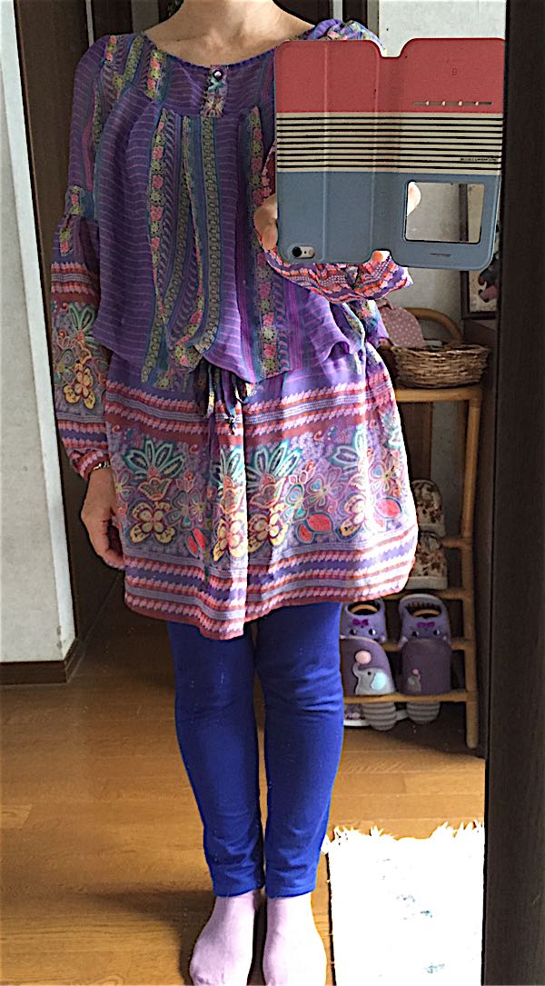 今日は、夢自歌で、薄紫・ピンク・緑のチュニック、青のパンツ、薄紫の靴下、ピンクのサンダル。
