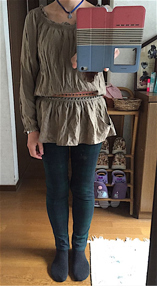 今日は、仕事、美容院、サイゼリアでランチ、婦人科受診で、茶にオレンジのチュニック、緑のチェックのパンツ、黒靴下、ベージュと茶の紐靴。青い紐・エーデルワイスのペンダント。