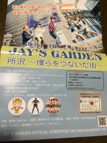 JAY'S GARDENの10/17(土)の所沢ミューズのライブに行きます。卓球のIさんとオトモダチチケットを買いました。2人で4,000円とお得。その代り、二人で1枚のチケットなので、一緒に入場しないといけないそう。CDも買いました。聴いてからライブ行かないとね。なぜか「頑張っていこうぜ」をライブで聴くと涙が出そうになるのです・・・何回かライブでも聴いたけど、今度はミューズのマーキーホールだから楽しみですね。
