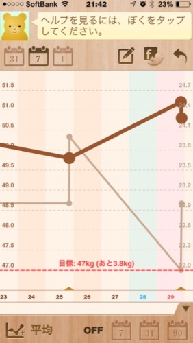 卓球合宿や、間食・夕食を食べ過ぎたせいか、体重は、夕食後・入浴前51.2kg、入浴後50.8kg。 体脂肪率は、22%から23%へ?せっかく減ってきたのに、また太ってきてしまった・・・またダイエット頑張らないとね。 体重のグラフです。1週間。1週間平均で1ヶ月3ヶ月。半年。1年間。1年半前から1年間。万歩計のグラフ。今日は、東秩父村の和紙の里。グランドゴルフしたけど、iphoneを身に付けてないから歩数には入ってない。それでも、4,378歩でいつもより多いですね。勤務校でも身に付けてないから、仕事の歩数は入ってないけど。昨日は、八丁湖散策、吉見百穴見学で、 7228歩も歩きましたね。卓球したけどiphoneを身に付けてないから歩数には入ってない。身に付けて、ウォーキングしたほうがいいかな?
