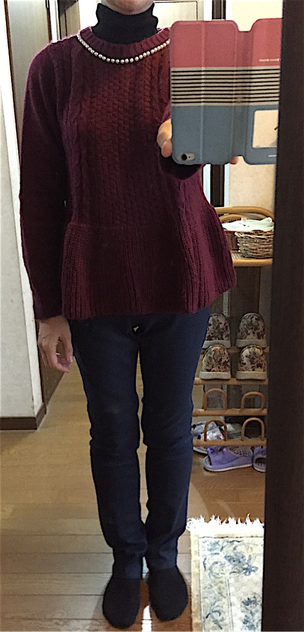 今日は、フレンドシップよしみにて卓球合宿で、黒タートル、ボルドーのパール付きセーター、青・黒のチェックパンツ、黒靴下、ベージュ・茶の紐靴、パールのピン。ワインレッドのダウン。
