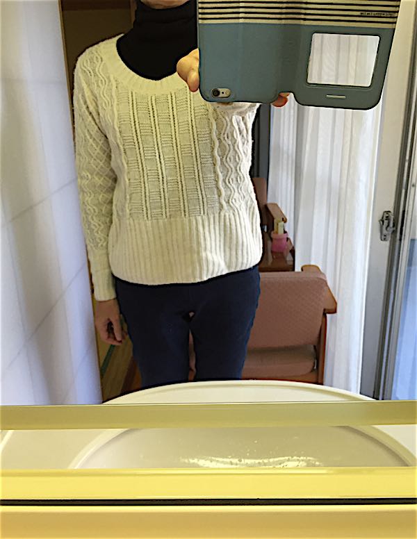 フレンドシップよしみでの卓球合宿2日目。グランドゴルフ、東秩父村の和紙の里で、黒タートル、白セーター、青・黒のチェックパンツ、黒靴下、ベージュ・茶の紐靴。パールのピン。青のカーディガンも。