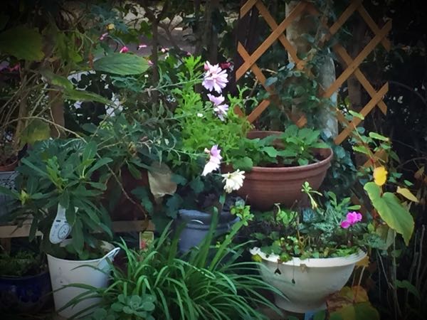 シクラメン。ペンタス。デルフィニウム・ミントブルーが枯れたかと思ったら、小さな芽が出てきました。冬越しできるといいなあ。手前は松葉菊です。ローズゼラニウム、ムルチコーレ。リボン付の帽子の鉢に鳥も止まってます。ポーチュラカのハンギング。ひっつき虫のオナモミ?。オナモミは、外来種のオオオナモミに駆逐されて絶滅危惧種らしいから、これはオオオナモミかな?http://matome.naver.jp/odai/2141758753333528301母子草。エーデルワイスの遠縁だそうです。