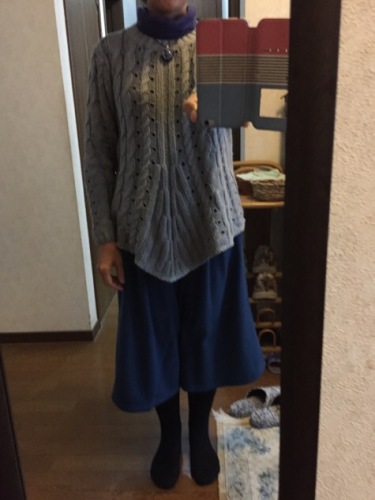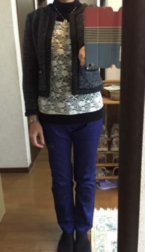 今日は仕事、花の撮影、義母との買い物、勤務校の女子会で、黒タートル、レースのセーター、グレーのジャケット、青いパンツ、黒い靴下、ベージュ・茶の紐靴、パールのピン、ガラスのカメオのペンダント。ワインレッドのダウン。