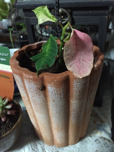 花などが萎れてたので、水やりしたら、(下の日記のように)http://plaza.rakuten.co.jp/friendly0205/diary/201511030000/寄せ植えしていたガーデンポインセチアが枯れかけてる・・・一昨日の朝、車のフロントグラスに霜が降りてたから、植物にも降りてたかな?・・・慌てて、鉢に植え直し、家の中に取り込んだのですが、茎が腐ってるのもあり、切って水に付けてみました。萎れた葉が元気になりといいなあ。色はもともと赤ではなく、ピンクです。もともと初秋は屋外で、寒くなってきたら室内に取り込めるようにポットごと寄せ植えするようにセットされてたのですが、ポットの後ろが格子になってるとはいえ、やはり根腐れ(茎腐れ?)しやすかったのかな?それを忘れ、元気ないからと水やりして腐らせしてかったかも・・・