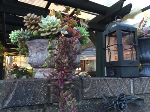 義母と買い物に行くのに、義母宅へ迎えに行ったら、ご近所の多肉植物が素敵だったので撮らせてもらいました。多肉もだけど、鉢やライトも素敵。花も咲いてる。多肉の寄せ植えもいいですよね。霜に当たっても大丈夫なのかな?うちも今、軒下に置いてる多肉があるのですが、霜が心配です。