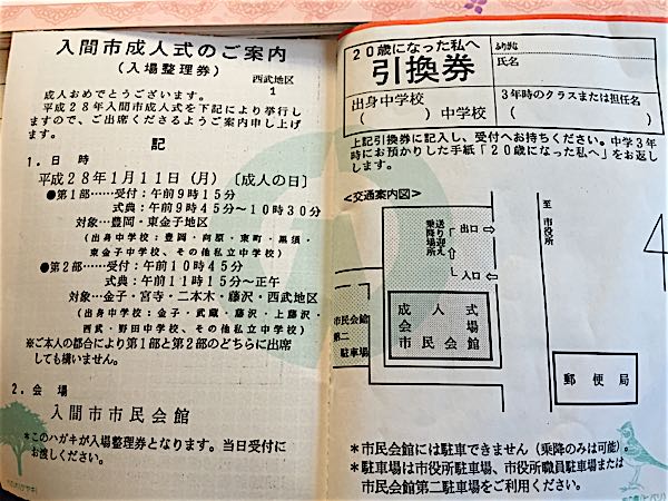 息子カズに来た成人式の入場整理券。もう大人になるんですね・・・まあ、まだ中身は子ども?・・・成人式に着るスーツは、大学の入学式に買ったスーツですが、靴は3万円もする靴を買ったそうだ・・・主人が「左右2つずつあるのか?」と訊くほど・・・2足分だと言いたかったらしい・・・