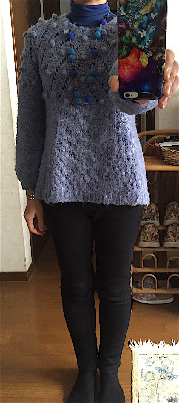 今日は、今年最後の教会で、青タートル、水色のボンボン付きニット、黒パンツ、黒靴下、ファー付き黒ショートブーツ。青のボンボンネックレス。緑のライトダウンも。