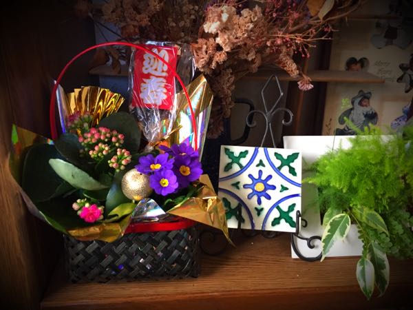 お正月飾り。カランコエ、プリムラジュリアンが籠に入ってます。タイルの右には、額縁入りの観葉植物。アジアンタム、アスパラガス・ナナスなど。玄関の下駄箱の上に、造花野やドライフラワーも。格子棚の上に絵葉書、教会でもらった額、ミニチュアハウスなど。カランコエ、プリムラジュリアン。注連縄飾りと花。ドアの上のウェルカムボードのところに注連縄飾りを掛けようかと思ったけど、高くて掛けられないのでやめました。球根ベゴニア・フォーチュン。シクラメン。ネメシア・メロウ。多肉・虹の玉。レウイシア。左からアメジストセージ、ガーデンプリムラ、カラーリーフゼラニウム。アメジストセージ。ガーデンプリムラ。カラーリーフゼラニウム。トレリスにも注連縄飾り。リース型ハンギングに、パンジー、達磨菊、松葉菊、多肉・虹の玉。初雪蔓もハンギング。ビオラ。イベリス・ブライダルブーケ。セネッティ・ブルーバイカラー。まだ咲かない、、、カンナ。チロリアンランプ。パンジー。ゴールドクレストに水引。クリスマスホーリーの赤い実が無くなってしまったので、万両の実を枝ごと刺しました。照葉葉牡丹も。ビオラ、初雪蔓のハンギング。ビオラ、ノースポール。独楽のスティックも。