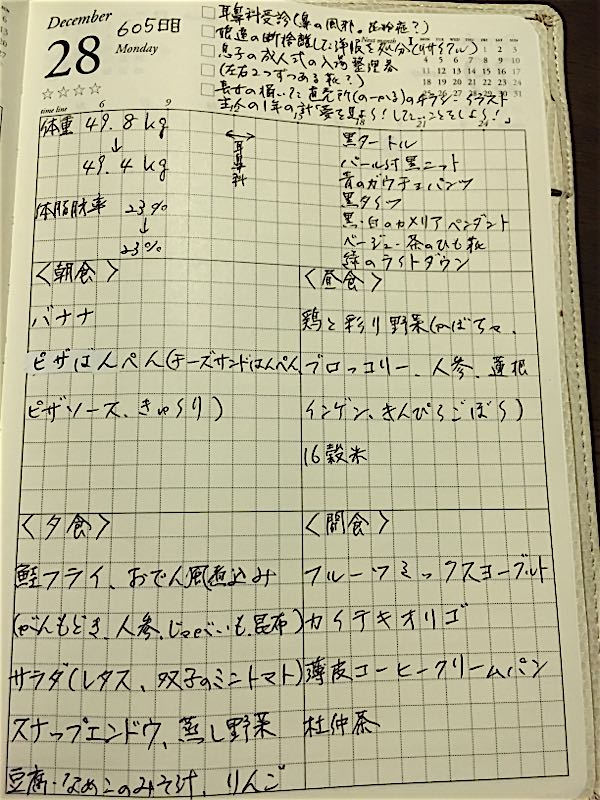 ダイエット食事日記605日目です。今日は、風邪で耳鼻咽喉科受診で、黒タートル パール付黒ニット、青のガウチョパンツ、黒タイツ、ベージュ・茶の紐靴、黒・白のカメリアペンダント、緑のライトダウン。先日娘たちが断捨離した洋服を、今朝ゴミ捨て場に運ぶのを手伝うと主人と約束したのに、寝坊して手伝えなかった・・・もちろんリサイクルの日なのですが、今日が今年最後なのです。昨夜写したのですが、主人1年の計・・・「夢を見よう、したいことをしよう」「私たちも、そうしていいってこと?」と訊いたら、自分だけだそう・・・まあ、私や子ども達は言われずとも、したいことをしてるか?・・主人は、今度の3月で再雇用5年も終わり、本当の意味の定年退職なので、来年度から自由になるのですよね。何をするつもりなのかな?・・・ようやく秋の絵から冬の絵に衣更え。年内に替えてくれて良かった。昨日まで、秋の絵だったのです。いつも主人が季節ごとに替えているのですよね。暖かい日が続いて、冬らしくないということもあったのかな?・・・まあ、年賀状も書き終えて、やっと余裕ができたからかも・・・朝食は、バナナ。チーズサンドはんぺんに、ピザソースをかけ、胡瓜を載せて、温めました。小さなピザトーストならぬピザはんぺん?ここしばらく風邪気味で、鼻がつまってよく眠れない・・・小川耳鼻咽喉科の予約をアプリでしました。最初33人待ちでしたが、しばらくして31人待ちに・・・自宅で10人待ちくらいになるまで待ってから、出かけました。それでも、待ったけどね。花粉症ですか?と訊かれ、分かりませんと言ったら、先のことは誰も分からないと言われてしまった。今まではどうか?と訊かれ、花粉症とは言われてないと言ったら、たぶん鼻の風邪でしょうと言われ、鼻の薬が出ました。花粉症かどうか私が訊きたいですよね。暖かいから、もう花粉症の患者が出てきてるのかな? まだ風邪の方がましですね。耳鼻科の帰りにスーパーで買ってきたお弁当2個。持ち合わせが少なかったので、スーパーのポイント500円券を合せて買えるものにしました。私は、管理栄養士監修の「鶏と彩り野菜の16穀米入りご飯弁当」。下にご飯が入ってます。主人には、10品目のおかずと雑穀入りご飯弁当。息子カズに来た成人式の入場整理券。もう大人になるんですね・・・まあ、まだ中身は子ども?・・・成人式に着るスーツは、大学の入学式に買ったスーツですが、靴は3万円もする靴を買ったそうだ・・・主人が「左右2つずつあるのか?」と訊くほど・・・2足分だと言いたかったらしい・・・また、長女マッキーが描いた直売所「のーかる」のチラシ。間食は、フルーツミックスヨーグルト、カイテキオリゴ。薄皮コーヒークリームパン。杜仲茶。豆腐夕食は、 鮭フライ。おでん風煮込み。がんもどき、人参、じゃがいも、昆布、コンニャク。サラダ。レタス、ミニトマト。ミニトマトをよく見てみると?双子のミニトマトです! くっ付いているので、シャム双生児かも、、、スナップエンドウ。昨夜の蒸し野菜。白菜・人参・ネギの柚子ポン酢和え。豆腐となめこの味噌汁。りんご。体重は、夕食後・入浴前49.8kg、入浴後49.4kg。体脂肪率は、入浴前後変わらず23%。主人は私がいくら風邪引いてると言っても、病院に行っても、大丈夫か?の一言もないし、何か手伝ってくれることもない、、、期待するだけ無駄だから、期待しないようにしよう、、、