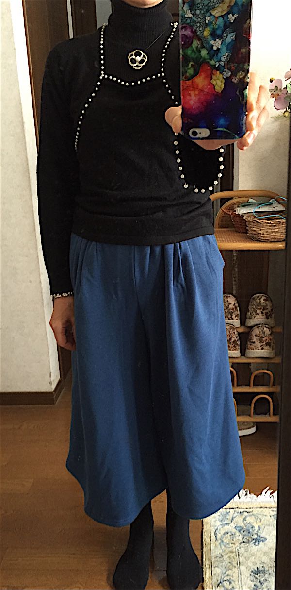 今日は、風邪で耳鼻咽喉科受診で、黒タートル パール付黒ニット、青のガウチョパンツ、黒タイツ、ベージュ・茶の紐靴、黒・白のカメリアペンダント、緑のライトダウン。