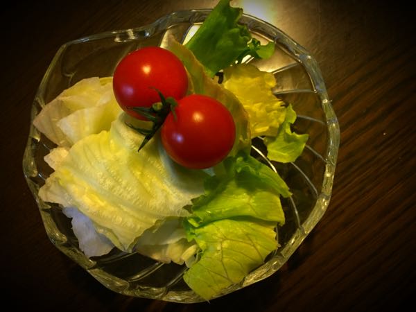 サラダ。レタス、ミニトマト。ミニトマトをよく見てみると?双子のミニトマトです! くっ付いているので、シャム双生児かも、、、