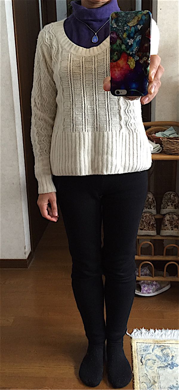 今日は、次女夫婦来訪、PAでランチ、大掃除で、青タートル、白ニット、黒パンツ、黒靴下、ベージュ・茶の紐靴。ガラスのエーデルワイスのペンダント、水色のピン、緑のライトダウン。
