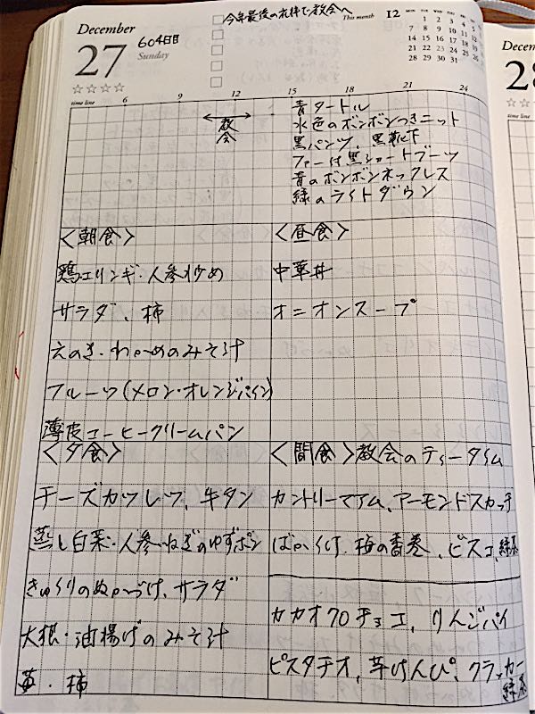 ダイエット食事日記604日目です。今日は、今年最後の教会で、青タートル、水色のボンボン付きニット、黒パンツ、黒靴下、ファー付き黒ショートブーツ。青のボンボンネックレス。緑のライトダウンも。朝食は、昨夜の残り物。鶏・エリンギ・人参炒め、サラダ、えのき・わかめの味噌汁、フルーツ(メロン、御アレンジ、パイン)。薄皮コーヒークリームパン。柿。今年最後の教会に行きました。礼拝でS牧師先生の証を聞き、思わずもらい泣き・・・牧師先生もいろいろな体験されてきたのですね。ありのままの自分をイエス様に受け入れられ、教会が自分の居場所となったそうです・・・前任の牧師先生夫妻には、毎年年賀状を差し上げていたのですが、引っ越し先が分からず、訊いたら、教会の住所を教えてもらいました。これで年賀状を出せます。うちに帰ってから書いて出しました。筆王の住所録も書き換え。礼拝後のティータイムで、牧師先生や皆さんにも年賀状を見ていただいたから、もう差し上げなくても大丈夫? 子ども達が日曜学校に来ていたので、写真を見て懐かしんでくれました。ティータイムでは、クリスマス祝会の残りのお菓子など。カントリーマアム、アーモンドスカッチ、ばかうけ、梅の香巻、ビスコ。緑茶と。赤カブ漬け。教会員の皆さんは、お握りなどの軽食を持ってきて食べ、これから大掃除だそうですが、私はパスさせてもらいました・・・帰ってから、主人と昼食。中華丼、オニオンスープ。間食は、カカオ70チョコ。りんごパイ。ピスタチオ、芋けんぴ、クラッカー。緑茶と。夕食は、チーズカツレツ。牛タン焼き。レモンで。蒸し野菜。白菜・人参・葱。柚子と柚子ポンをかけて。胡瓜の糠漬け。サラダ。サニーレタス・ミニトマト。大根・油揚げの味噌汁。苺。柿。