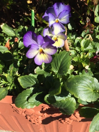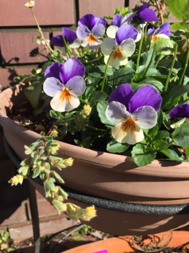 ビオラ。ノースポール。下はパンジー。 ビオラのハンギングボール。 紫と黄色のビオラも。左は姫小菊、右はラナンキュラス。左はビオラ、右はパンジー。大して大きさが変わらないか・・・パンジー。