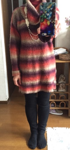 今日は、花の撮影、ガストでランチ、買い物、片付けで、オレンジのタートル、茶・オレンジのニット、黒パンツ、黒靴下、白の花とパールのネックレス、ファー付黒ショートブーツ。緑のライトダウン。