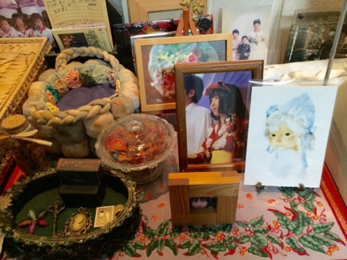 帰ってきて、リビングの棚の片づけ。写真立てが多くて、入りきれない・・・アンティークっぽい小物入れに、小物を入れてます。ちひろの絵葉書も。ルノワールの絵も。子ども達の写真。