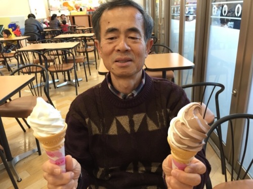 ベイシアのフードコートでお茶。ソフトクリーム130円とは安い!主人はいつものバニラ、私はチョコ・バニラのミックスです。