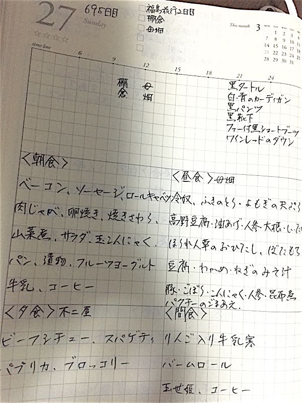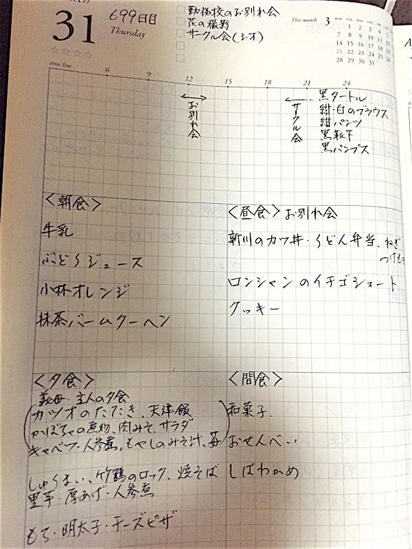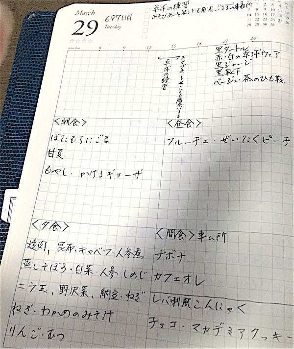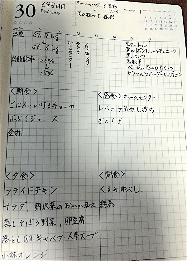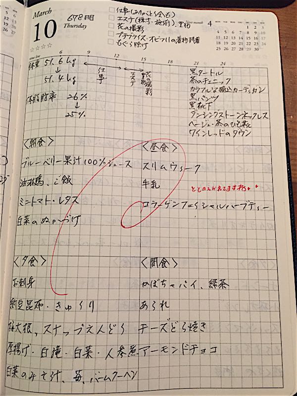 ダイエット食事日記678日目~683日目を日記帳にようやく書きました。このブログには毎日ダイエット食事日記を書いてるのですが、アナログの日記帳にはブログを書きうつせばいいと思うとつい後回しになり、溜まってしまうのです・・・ようやく678日目~683日目を書いたので、アップしますね。1ヶ月おきに、エステで食事日記を見てもらうので、それまでに書けばいいと思うのですが、まるで夏休みの宿題のように、溜めてから焦ってしまうのですよね・・・