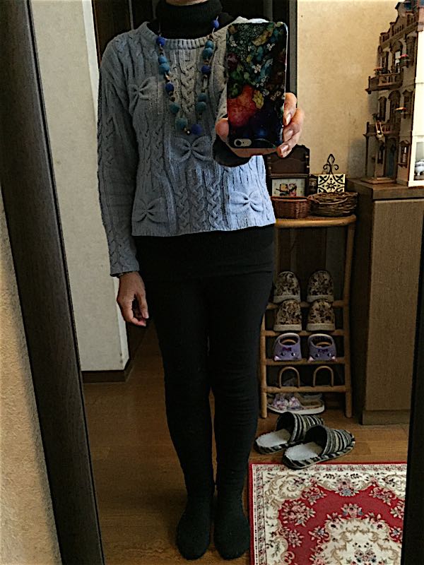 今日は、声楽の個人練習、花の撮影で、黒タートル、水色のセーター、黒パンツ、黒靴下、青のボンボンネックレス、ベージュ・茶の紐靴。