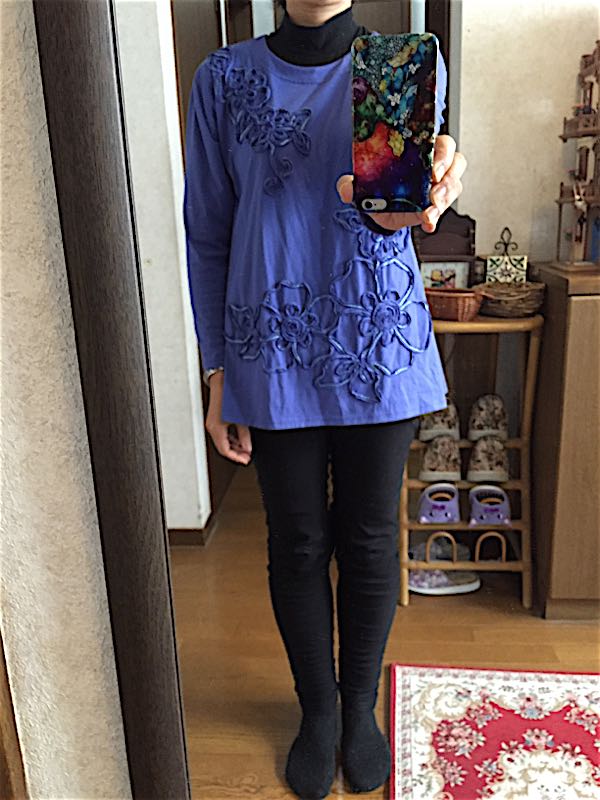 今日は、ホームセンターで買物・ランチ、花の植付け・撮影で、黒タートル、青のリボン刺繍チュニック、黒パンツ、黒靴下、ベージュ・茶の紐靴。カラフルなボーダーカーディガン。