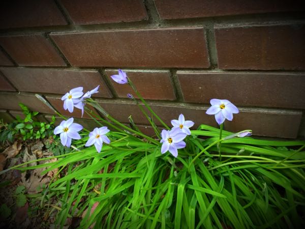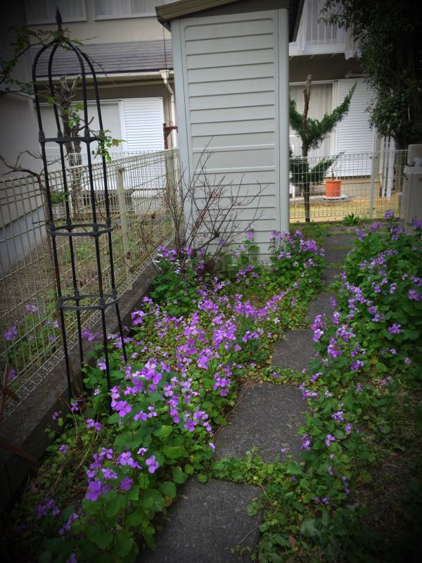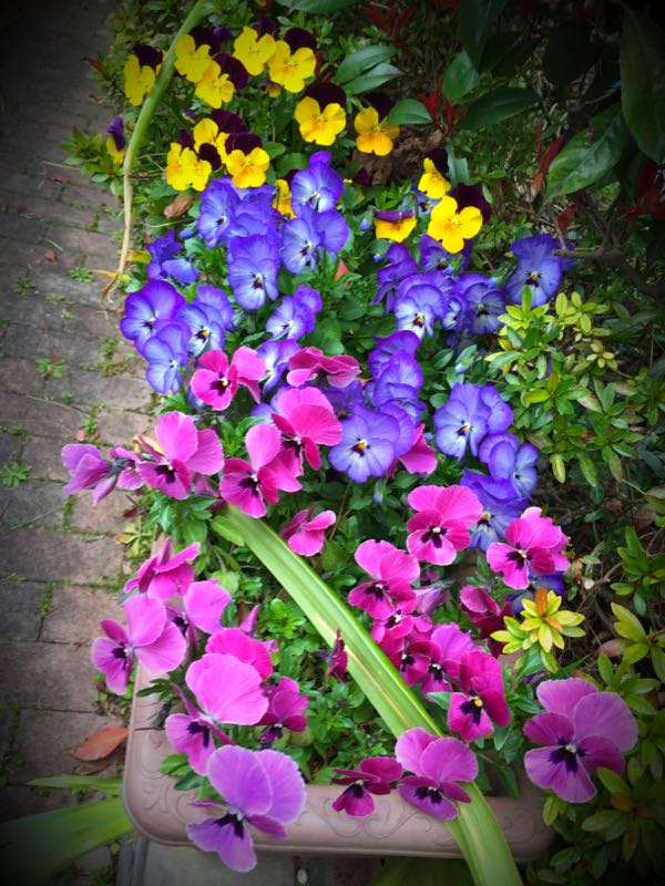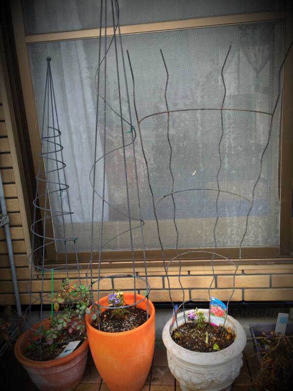 パンジー。花韮。つる日日草。照葉葉牡丹。菫。クレマチス・ピンクレッド。白妙菊、パンジー。紫花菜。ストック、カルーナ・ガールズ、ガーデンシクラメン。ストック。ガーデンシクラメン。海老根。花芽が出てきてます。雪柳。花ずおう。連翹(れんぎょう)。バラ。ヒヤシンス。ムスカリ。カンナ。新芽が出てきてます。