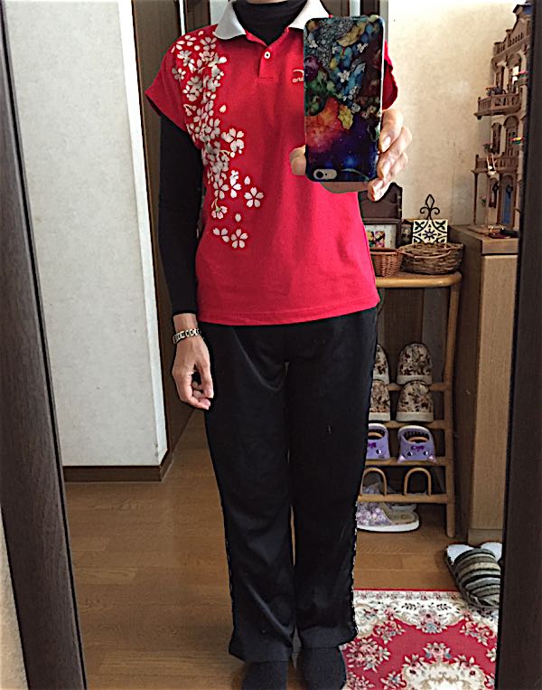 今日は、卓球の練習、あそびあーと☆こども劇場いるまの事務所で、黒タートル、赤・白の卓球ウエア、黒ジャージ、黒靴下、ベージュ・茶の紐靴。