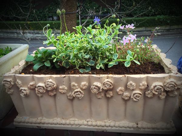 バラ柄のプランターに、芝桜・キャンディストライプ(多摩の流れ)、ブルーデージー・カシオペア、サフィニアフリル・コーラルピンクを植えました。芝桜・キャンディストライプ(多摩の流れ)。芝桜では、一番人気だそうですね。ブルーデージー・カシオペア。サフィニアフリル・コーラルピンク。土がかかってしまった。少し切って、挿し芽をしてみました。カンパニュラ・パール・ブルー。