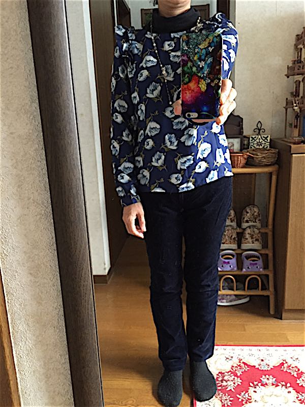 今日は、勤務校のお別れ会、花の撮影、サークル会で、黒タートル、紺に白の花柄のブラウス、紺パンツ、黒靴下、黒パンプス。青いカーディガン、黒の皮ジャンも。