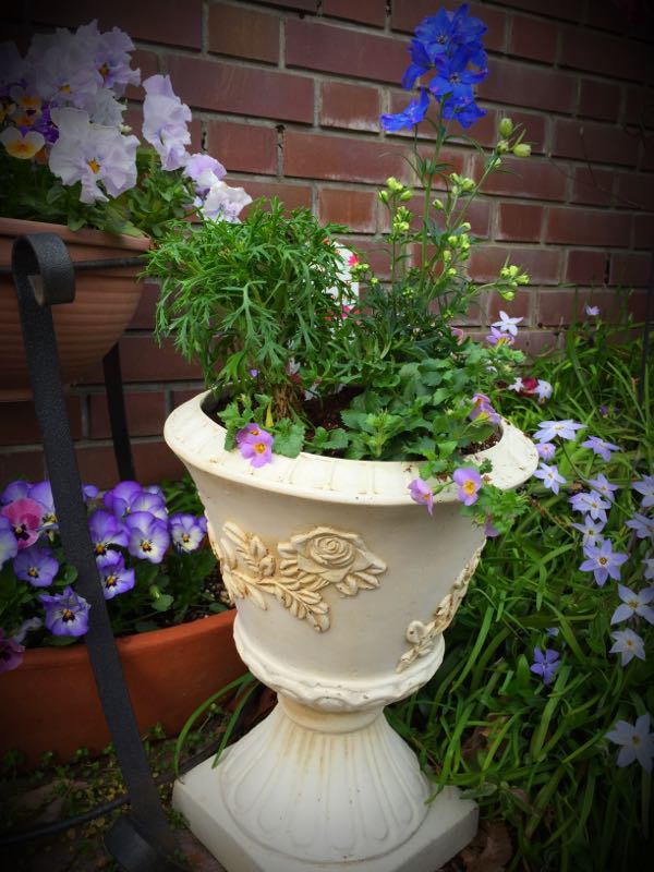 バラ柄のスタンド鉢に、ステラ・イエローアイ、ボンザマーガレット・ラズベリー、デルフィニウム・ミントブルーを植えました。ステラ・イエローアイ。ボンザマーガレット・ラズベリー・リーフ(一重)咲き。デルフィニウム・ミントブルー。プランターの左に深山蛍蔓(ミヤマホタルカズラ)を植えました。青一色ではなく、青と白が入り混じってる花を選んでみました。