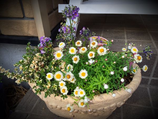 ホームセンターで買ってきた花を植付けました。鯛釣草を見たら、茎が折れてしまってる!、、、思わず悲鳴をあげてしまいました、、、捨てるには惜しいので、ガラス瓶に挿しましたが。持ち手付きの鉢に、ロベリア・アズーロコンパクト3種。ブルーウィズアイ。スカイブルー。ラベンダーシャワー。白も買おうかと思いましたが、やめました。ハーブを3種買いました。ラムズイヤー。レッドチコリ。ローズマリー・マリンブルー。菫が零れ種で生えてきた鉢に植えました。