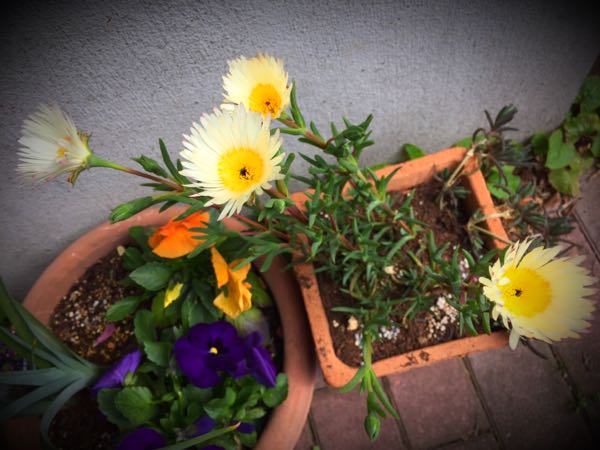 リビングストーンデージーを、モザイクガラスの鉢に植え、オリーブの実柄のテラコッタの上に載せました。松葉菊に似てるけど、こちらは一年草なのですね。松葉菊の白を、松葉菊・ピンクが植えてある鉢に植えました。白にピンクが混じってます。松葉菊・オレンジをハート形のハンギングバスケットに植えました。水切れに強いから。折れてしまった鯛釣草をガラス瓶に生けました。咲いてくれるかな?ヒヤシンスも踏んで折ってしまった・・・こういう時しかうちには生けないから、たまには折れるのもいいか・・・