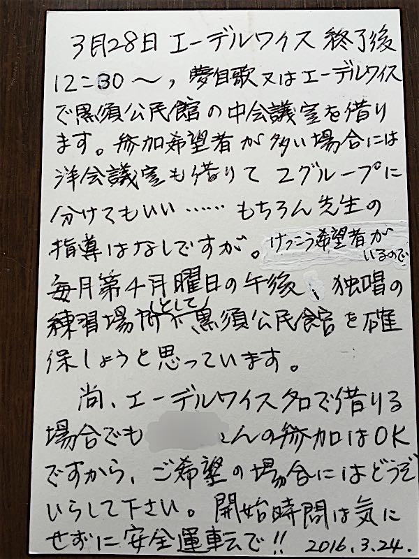 黒須公民館で、声楽の個人練習。夢自歌の有志です。アベマリア(シューベルト)<ラテン語>、「仏法僧の森」(2・3番)は、なんとか覚えました。「Time to say goodbye」は、なかなか覚えられませんね。母畑のお土産の母畑ダムという胡桃柚餅子を持っていって配りました。アセロラドリンク。のど飴も貰いました。パソコンで作った伴奏のCDと、個人レッスンの時の録音のCDをかけて練習。重唱の「サントワマミー」。オブリガードを歌ってます。自分で適当にアレンジしてるのですよね。クリックすると歌が聞けます。良かったら聞いてみてくださいね。http://www.geocities.jp/maimi_to/santowamamii3_15.mp3シューベルトのアベマリア・・・http://www.geocities.jp/maimi_to/abemaria3_15.2.mp3ほとんど中音域ですが、少し高音域があるので出しにくい・・・「Time to say Goodbye」、「仏法僧の森」他の方達の歌も、適当ですがキーボードで伴奏しました。