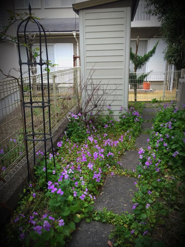 紫花菜、バラ。アオキ。初雪蔓。モッコウバラ。花芽がついてます。モッコウバラ、クレマチス・ロウグチ。チューリップ。ムスカリ。クレマチス・パテンス系・ヴィオレット。オベリスクに。いっぱい出てきましたね。アイビー柄のトレリスに。忘れな草。冬知らず。山しゃくやく。
