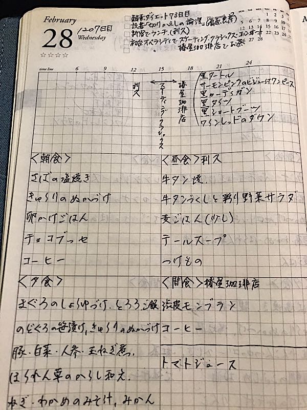 ダイエット食事日記1207日目です。 今日は、酵素ダイエット73日目。読書「切りかえしの論理」、新宿でランチ、コンサート・スケーティング・クラシックス、椿屋珈琲店でお茶。黒タートル、サーモンピンクのビジュー付きワンピース、黒タイツ、黒ショートブーツ、ワインレッドのダウン。黒カーディガンも。朝食は、鯖の塩焼き、胡瓜の糠漬け、卵かけご飯。チョコブッセ、コーヒー。「切りかえしの論理」(増原良彦)を読みました。屁理屈?というか、面白い論理でしたね。東大卒とは思えない感じ。内容紹介がよく見えないので、文庫紹介のページも。筆者紹介。まあまあ面白かったですね。日本人が失敗した時に思わず笑ってしまう微苦笑は、外国人には理解されないというのも。普段は能面のように無表情なのが崩れるという。どちらかというと、普段も微笑しているような気がしますが。今日は、夫とコンサート・スケーティング・クラシックスに行きます。クラシックのコンサートは寝てしまいそうですが、フィギュアスケートの鈴木明子選手の解説もあるそうだから、楽しめるかな。以前、パステル音楽館でもフィギュアスケートの曲をテーマにしたことがありましたね。新宿でランチ。新宿三丁目駅から、絵本の国のアリス(不思議の国のアリスワールドの店)に行きたくてやっと辿り着いたら、ランチ営業してませんでした、、、残念、、、仕方なく、新宿駅の新宿ルミネESTの7階へ。私は牛タンの利久に入りたいと言ったら、夫は嫌だと言うので、別々の店へ。牛タン焼きと選べるサラダセットに。牛タン焼き、サラダ、テールスープ、麦ごはん。麦ごはんは少なめにしてもらったけど、ほとんど食べなかった。牛タン焼き。牛タン尽くしと彩り野菜サラダにしました。夫は、韓国料理店で石焼ビビンバ。最初、パエリアの店にすると言うから別れたのだけど、韓国料理なら私もそれで良かったかな。新宿から京王新線に乗り、初台の東京オペラシティコンサートホールへ。クロークにオーバーやダウンを預けました。スケーティング・クラシックス。S席。プログラム。演奏曲目。コンサートホール。少し寝てしまったけど、演奏もお話も良かったですね!アンコールのサン=サーンスの「白鳥」も感動!羽生結弦の2018年平昌オリンピックのエキジビションの曲と言ってたけど、同名の白鳥でしたね。「ノッテ・ステラータ 星降る夜(白鳥)」 Notte Stellata (The Swan) byイルヴォーロ(デビッド・ウィルソン振付 タチアナ・タラソワ選曲)スケートのユーチューブを見たくなりました。平昌オリンピックのはテレビで見たけど。帰りがけにオペラシティ内の椿屋珈琲店でお茶。見たことあると思ってブログを調べたら、3年前新宿の椿屋珈琲店に行ってました。椿屋珈琲店でお茶自家製ケーキセットにします。今日28日はつばきの日の日で焼き菓子がお得だそう。ケーキを見てから選びます。レトロな照明。2人と言ったら、カウンター席でもいいですか?と聞かれ、いいですと答えました。サイフォンとか見えるから、かえっていいかな。重厚ですよね。障子みたいな感じ。砂糖入れも素敵。3年前も撮ってたと言ったら、夫に進歩ないなあと言われてしまった、、、サイフォンで淹れてます。珈琲、ミルク入れ。フェルメールの「牛乳を注ぐ女」のようなミルク壺?夫は珈琲シフォン。私は渋皮モンブラン。夢二の「宵待草」の詩が書いてありました。歌ったこともあります。やけに喉が渇くので、帰りがけホームでトマトジュースを買って飲みました。夫に言ったら、糖尿病じゃないの?と言われてしまった。暑くもあるので、帰って熱を測ったら36.7℃。熱はないか・・・夕食は、まぐろの醤油漬け、とろろ、のどくろの笹漬け、豚・白菜・人参・玉葱煮、胡瓜の糠漬け、ほうれん草の辛し和え、葱・わかめの味噌汁。みかん。まぐろの醤油漬け。とろろも。やまかけ丼に。ご飯は少し。昼食は牛タンを食べ、とろろを別注文しようかと思ったけど、やめて良かった。豚・白菜・人参・玉葱煮。のどぐろの笹漬け。胡瓜の糠漬け。ほうれん草の辛し和え。葱・わかめの味噌汁。みかん。あすけん食事日記。アドバイス。