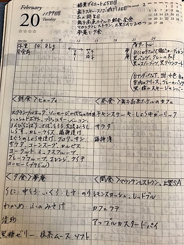ダイエット食事日記1199日目です。 今日は、酵素ダイエット65日目。舞子スキー旅行3日目。私の誕生日。青タートル、白にカラフルな編み込みのカーディガン、黒パンツ、グレー靴下。スキーには、白のアンダーウェア、紺・水色・白の雪柄フリース、グレーのスキーパンツ。紫・緑のチェックのスキージャンパー。写真は昨日のですが。朝食は、舞子高原ホテルのビュッフェ。スクランブルエッグ、ソーセージ、ハッシュドポテト、ブロッコリー、ベーコン、南瓜のそぼろ炒め、きんぴらごぼう、鯖、とろろ、大根おろし、しらす、カレーライス、福神漬け、マグロの醤油漬け、クロワッサン、サラダ。コーンスープ。カルピス、ヨーグルト、ミックスフルーツ、グレープフルーツ、オレンジ、ライチ。コーヒー。今朝はブラジルにしました。昨日はガテマラ。チェックアウトぎりぎりの10時に部屋を出ました。息子は一寝入りしてましたね。荷物を宿泊者専用のロッカーに預け、ゲレンデへ。高校のスキー大会もあり、昨日リフトから見かけましたね。息子は先にリフトに乗り、滑りに行きました。昨日、中学生達が居た雪山。子ども達が遊んでます。短いリフトに乗り、一回目は麓まで降り、二回目は長峰エリアへの連絡リフトの方へ行って乗りました。長峰エリアの麓まで滑ってからゴンドラに乗り、山頂駅へ。息子はとっくにゴンドラへ乗ってたらしい。山頂のカフェ・いただき。展望台もあるのかな。初心者コースを滑ってたのですが、林間コースで地図ないですか?と呼び止められました。谷にスノーボードを落としてしまい、場所を連絡するのに地図が見たかったらしい。ゴンドラの山頂駅から降りてくるランランコースですね。麓まで降りる途中、昨日休んだマウンテンレストランでまた休憩。ちょうど、息子とも一緒になったので。息子はもう何回も滑り、ビュンビュンコースやグングンコースも滑ったらしい。リフトの下も一回滑り、木の枝に当たったりしたそうだ。全く危ないですよね。マウンテンレストランで、レモンスカッシュとレッドブル。息子がレッドブルのCMのスキーの動画を見せてくれた。雪山の木の間を滑ったり、パラグライダーを背負って滑るなど。それを見てたらますますモチベーションが上がったと言ってたけど、あまり危ないことはしないで欲しい。ヘルメットが必要かしら。夫は膝が笑ってきたから、後一回くらいにしようかなと言って、先に行った息子をリフト乗り場で待つらしい。私はマウンテンレストランで待機。2人が滑ってきたら、電話をくれるので、すぐに出てくるようにとのこと。最初は、長峰エリアの麓の日帰りセンターで昼食にしようかと言ってたけど、帰りが面倒なので、舞子高原ホテルのレストランで食べることにしました。着替えや荷物、車もホテルだしね。なるべく早く帰りたい。電話があり、出て一緒にホテルまで滑っておりました。途中、また連絡リフトに乗った時、息子が写真を撮って送ってくれました。レンタルの用具を返却し、着替えてから、ホテルの大浴場・飯士の湯で入浴。宿泊者は、チェックアウト後もバスタオル200円で入浴できる。自分のバスタオルで入浴してた人も居たけどね。私と息子は入浴。夫は自分のスキー道具などを車に積んでいました。体重は、昼食前・入浴後54.8kg。昨日より0.2kg増えてしまった。入浴後、ホテルのカフェでランチ。私はチキンステーキ・醤油ガーリックプレート。夫はチキンステーキ・トマトソースプレート。私は福神漬けも貰い、ご飯は残しました。息子は、カツカレー。3日目にして、ようやく晴れてきました。山がよく見える。舞子高原ホテル。駐車場から。夫と息子。夫と私。帰りがけ、関越道の上里SAのカフェでおやつ。息子は水出しコーヒー、私はアイスカフェラテ。夫はブレンドコーヒー。私はアップルカスタードパイ。夫は抹茶・バニラミックスソフト。帰りの車から見た夕焼け。うちに帰ってから、義母・夫・息子と夢庵で夕食。牛タンを注文したら、もう牛タンフェアが終わって無かったので、贅沢海鮮丼に変更。うに、中トロ、いくら、紫蘇。わかめと麩の味噌汁、漬物。ご飯は息子にあげました。夫は鍋焼きうどん。息子は夢庵御膳。海老天のしっぽをくれました。私が好きなのを知ってるので。義母はねぎとろ丼。黒糖ゼリーと抹茶ムース。ソフトクリームも。義母が注文し、みんなで少しずつもらいました。あすけん食事日記。夫のお弁当は、冷凍食品とパックのご飯になってしまった・・・アジフライ、ひじき入りハンバーグ、ミニオムレツ、梅干し、いんげん、きんぴらごぼう。麦ご飯。
