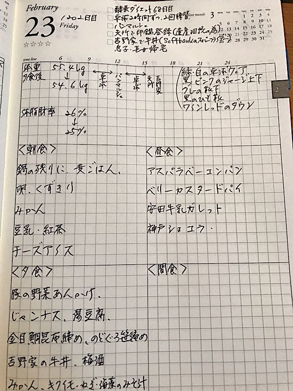 ダイエット食事日記1202日目です。 今日は、酵素ダイエット68日目。卓球2回、パン屋、印鑑登録、吉野家、息子・長女帰宅。緑・白の卓球ウェア、黒・ピンクのジャージ上下、グレーの靴下、黒の紐靴、ワインレッドのダウン。昨夜遅く息子が帰宅し、今日から地元の友達と河口湖へ一泊旅行するそう。朝食は、昨夜の鍋の残りに、麦ごはん、卵、葛きりを入れました。みかん。豆乳・紅茶。智光山公園の体育館で卓球の練習。Tさんとシングルスの試合などしました。終わってから、チーズアイス。帰りがけに、パンマルシュ・飯能店に寄り、アスパラベーコンパンと、ベリーカスタードパイを買ってイートインで食べました。100円パンを1つ無料というので、寄ったのです。200円のところ100円で済みましたね。そのまま西武体育館へ行き、また卓球の練習。ダブルスの試合などしました。今日は体育館のはしごで卓球の練習を2時間ずつ、4時間もしてしまった。終わってから、支所に行き、印鑑登録をしました。父の相続の為に必要なので。マンション2軒あるのですが、売買契約書が見つかり、売却しても利益は上がらないと証明できる。相続税もかからないとわかったので、2軒とも妹の名義にするという・・・1軒は母の名義にすると言ってたのですが、売却して妹名義の部屋の修繕資金にするからと。修繕費用を出すのに贈与税がかからないようにとか、売却するのに家族信託する必要がないからかな。私と母は現金を少しなのですが、妹が母と同居して面倒を見るというし、シングルマザーなので母が心配してるのです。仕方ないけど、ほとんどが妹というのもね・・・見てもらうからありがたいのですが。Softbankのスーパーフライデーで、吉野家の牛丼を貰ってきました。夫の勤務先への新潟土産。残りの一個を持ち帰ってくれたので、食べてしまった。神戸ショコラ・濃厚ミルク。長女が南伊豆から帰り、河津桜と菜の花を持ってきてくれました。みかんもくれました。夕食は、豚の野菜あんかけ、じゃこ茄子、湯豆腐、金目鯛昆布締め、のどぐろ笹締め、吉野家の牛丼、梅酒。キクイモ・葱・海藻の味噌汁、みかん。金目鯛昆布締め、のどぐろ笹締め。金目鯛昆布締め、のどぐろ笹締め。豚の野菜あんかけ。じゃこ茄子。河津桜、菜の花。湯豆腐。ねぎ、ふのり、磯海苔、わかめ。海藻も長女が持ってきてくれたもの。さらりとした梅酒。長女と夫はビール。吉野家の牛丼を3人で分けました。紅ショウガも長女持参の物。キクイモ・葱・海藻の味噌汁。みかん。体重は、夕食後・入浴前55.4kg、入浴後54.6kg。酵素ダイエット68日目。卓球2回、パン屋、印鑑登録、吉野家、息子・長女帰宅。3日前より0.2kg減りました!体脂肪率は、26%から25%へ。あすけん食事日記。アドバイス。