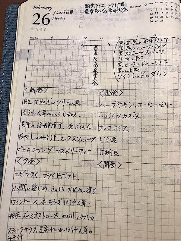 ダイエット食事日記1205日目です。 今日は、酵素ダイエット71日目、愛卓友の会卓球大会。紫・黄色・黒の卓球ウェア、黒・赤のハーフパンツ、黒のスポーツスパッツ、白・青の卓球靴下。黒・ピンクのジャージ上下、黒の紐靴、ワインレッドのダウン。朝食は、鮭・玉ねぎクリーム煮、ほうれん草の芥子和え、長芋の梅酢漬け、もやしの味噌汁、ミックスフルーツ。麦ごはん。ピーカンナッツ・ラズベリーチョコ。昼食は、ハーブチキン、コーヒーゼリー、つぶらなカボス。愛卓友の会卓球大会に参加しました。来月は12日。もう申し込みました。1組から11組まで。今回は一応?1組でした。今日は1組に付き卓球台が1台ずつです。始まる前に練習してから、チョコアイス食べて一休み。このブログで愛卓を紹介してくれてうれしいと、愛卓スタッフにどら焼きをもらいました。ペアのTさんと、試合の合間に早速いただきました。ありがとうございます!第1組で6チーム。1勝4敗で6チーム中5位。今日は浜卓と体育館を分け合ってたので、卓球台が少なく、3セットで2セット先取したほうが勝ちでした。いつもは5セットで3セット先取なので、今日はあっという間に勝敗が決まってしまう感じ。1勝は2-0でしたが、4敗は0-2が2回、1-2が2回。ヂュースも結構あって、惜しかったけど仕方ないかな。次回は第2組だとは思うけど、その方が少しは勝てて楽しいかも。ミスしても、スマッシュしたほうが気持ちいいかな。最初は結構決まったのに、だんだん決まらなくなってしまった・・・思い切りやっていいよとTさんに言われたのにね。組毎に優勝とX賞。X賞は最下位以外でくじかな? 今日はX賞をもらえてラッキー。賞品は甘納豆でした。帰って早速、小袋を一つ食べてしまった。どら焼きも甘納豆も美味しい。夕食は、エビフライ、フライドポテト、小鯛の笹締め、ウィンナー・ペンネ・玉葱・ほうれん草・粉チーズのミネストローネ、胡瓜・大根の糠漬け、セロリ・パプリカのスティックサラダ、豆腐・わかめ・ほうれん草の味噌汁。エビフライ、フライドポテト。小鯛の笹締め。胡瓜・大根の糠漬け。豆腐・わかめ・ほうれん草の味噌汁。セロリ・パプリカのスティックサラダ。ガーリックマヨネーズで。夫のお弁当は、エビフライ、フライドポテト、小鯛の笹締め、ウィンナー・ペンネ・玉葱・ほうれん草・粉チーズのミネストローネ、胡瓜・大根の糠漬け。紫蘇にんにく、南高梅の梅干し、胡麻昆布、麦ごはん、胡麻、海苔。あすけん食事日記。アドバイス。